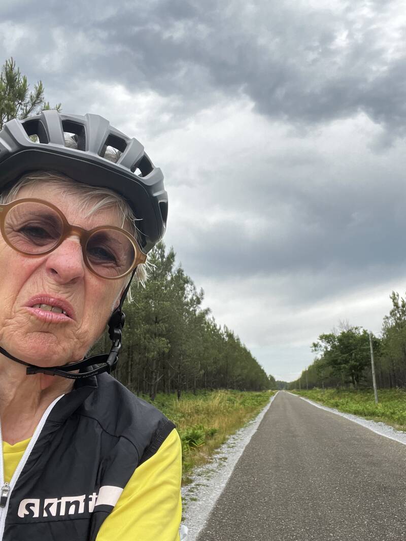 Zondagavond kan ik de tent opstellen op het erf van een oude boerderij, bij Marie Therese, een (héél) oude dame. Ik ben er de enige gast. Tot er een fietsster het veldje opdraait. Een belgische nogwel! Beetje gelijkaardig scenario - we leggen samen wat er nog aan eetbaars in de tassen zit ( je komt hier op een hele dag geen ene winkel tegen🫤). Marie Therese brengt ons nog een borreltje en begint te zingen. Met een bibberende maar toonvaste stem zingt ze 'Boire un petit coup' - van ene Marcelle Bordas. Een liedje uit de oude tijd. Zelf zong ze nog in de opera van de Landes.