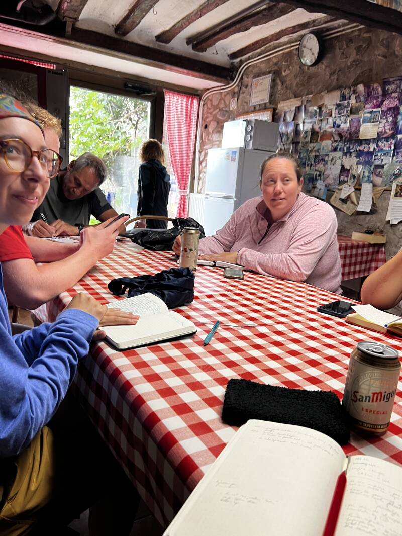 Tijdens één van de regenbuien vluchtten we in de albergue naar binnen Zaten we daar - met z'n allen wat te schrijven of tekenen - met een biertje. 'So camino', merkte iemand op.